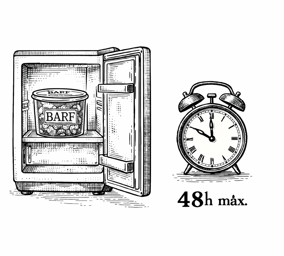 Evite la exposición prolongada del alimento BARF a la luz solar. Si la mascota no lo consume en ese momento, colóquelo nuevamente en el refrigerador y consérvelo allí.