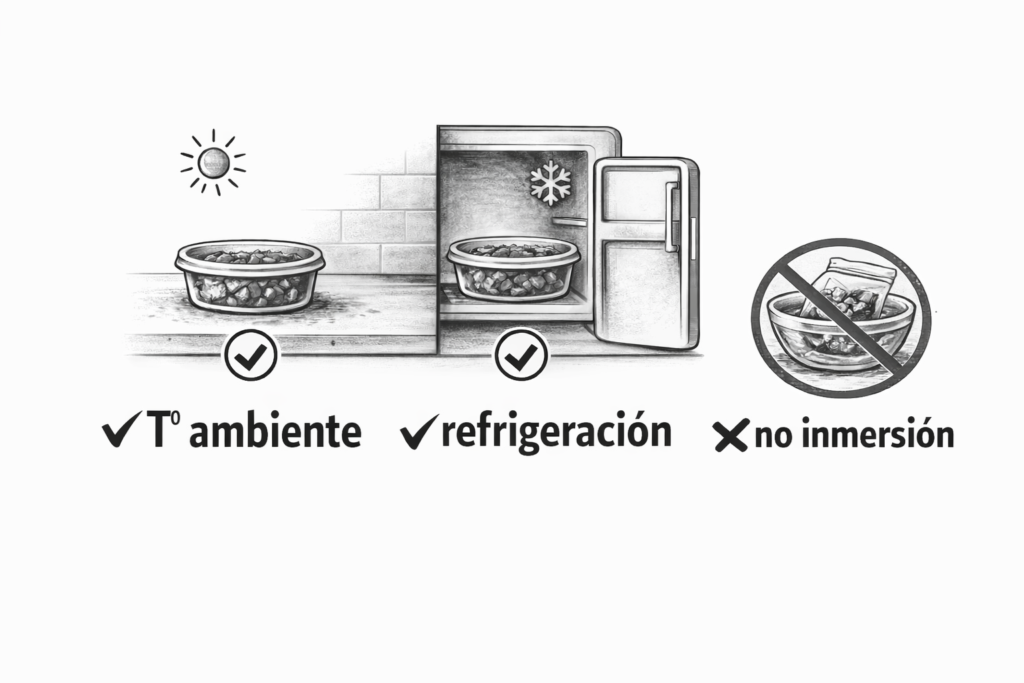 Coloque el producto en refrigeración o descongélelo a temperatura ambiente con la anticipación necesaria, manteniéndolo sobre un recipiente para evitar derrames.
